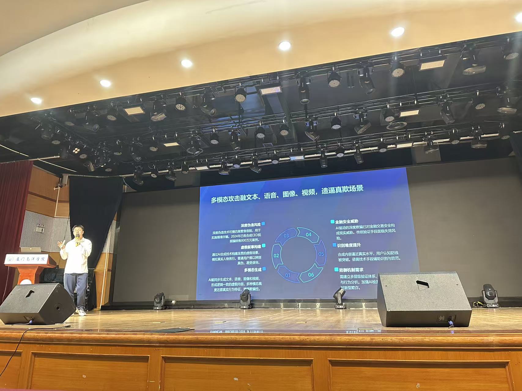 在第三环节,主持人围绕《AI新媒体运营与安全:应对多模态攻击》展开深度讲解。通过剖析深度伪造视频、AI合成语音、图文诱导等新型风险,引导学生思考如何在内容生产与传播中筑牢安全防线。现场还设置了互动问答,同学们就”AI版权归属”“虚假信息识别”“课程实践机会”等问题踊跃提问,嘉宾一一耐心解答,将活动推向高潮。