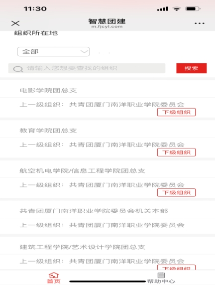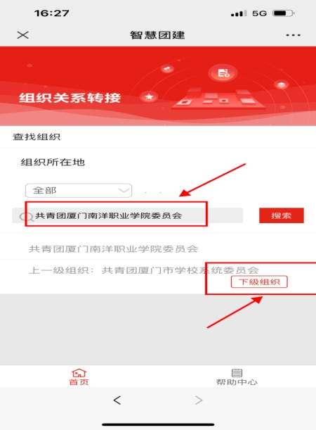 输入“共青团厦门南洋职业学院委员会”等关键词,点击“搜索”,点击“下级组织”