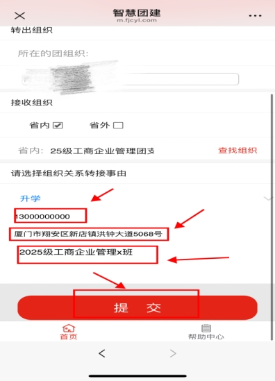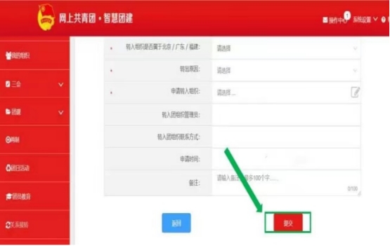 ③申请转入组织:选择组织【团福建省委→→厦门团市委→→市属高校团组织→→厦门南洋职业学院团委→→XX团总支→→XX团支部】,组织会陆续进行审核接收。