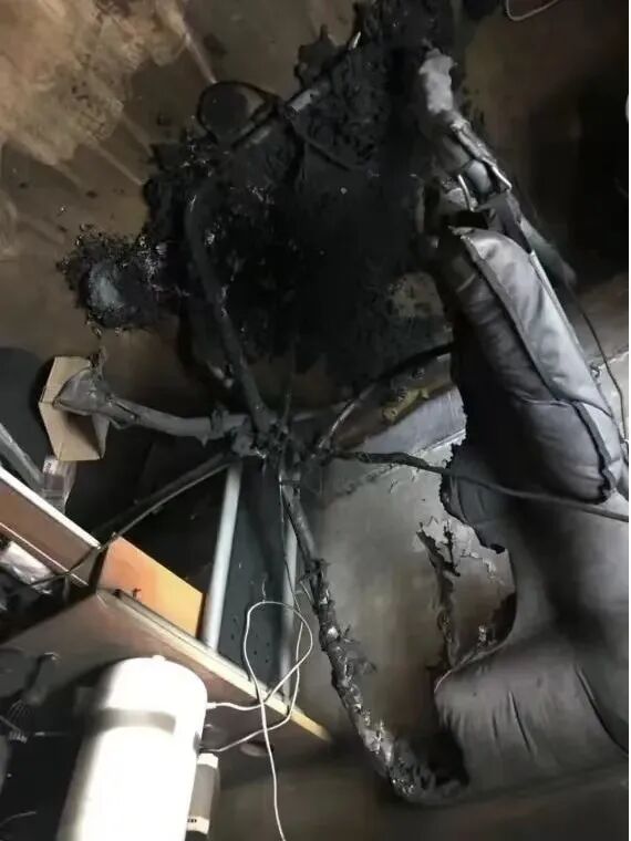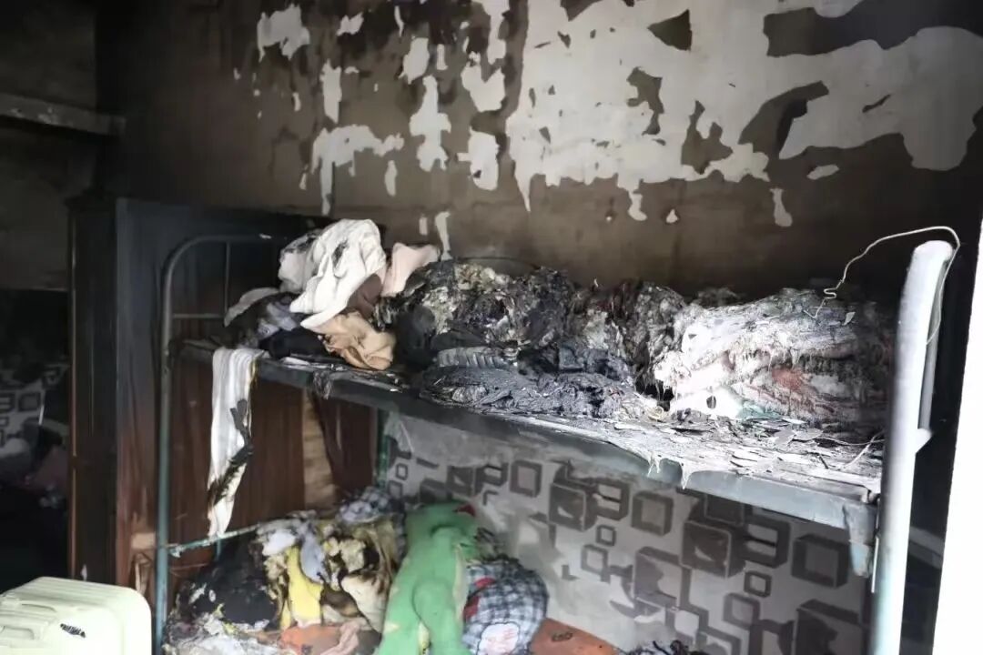 某高校寝室疑似因使用热水棒引发火灾。火势扑灭后,寝室变得面目全非,一片焦黑。