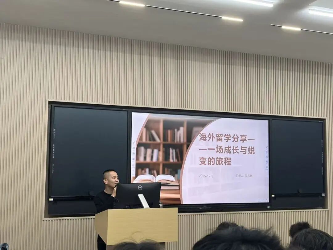 2025 年 12 月 10 日,吴志敏老师以 “海外留学 —— 一场成长与蜕变的旅程” 为主题开展分享,核心围绕留学初衷(个人学术追求、职业规划) 与目的地选择依据(教育资源、专业优势、文化氛围) ,详解了异国他乡的学习新体验(互动式课堂、学术研究能力提升、多元协作) 与文化碰撞中的生活感悟(生活适应、跨文化沟通、视野拓展) ,提炼出留学带来的独立能力、抗压能力、职业规划清晰化等核心成长,并从行前准备、学习、生活、心态调整四方面给出未来留学生建议,最后致谢相关支持方并开放互动交流。